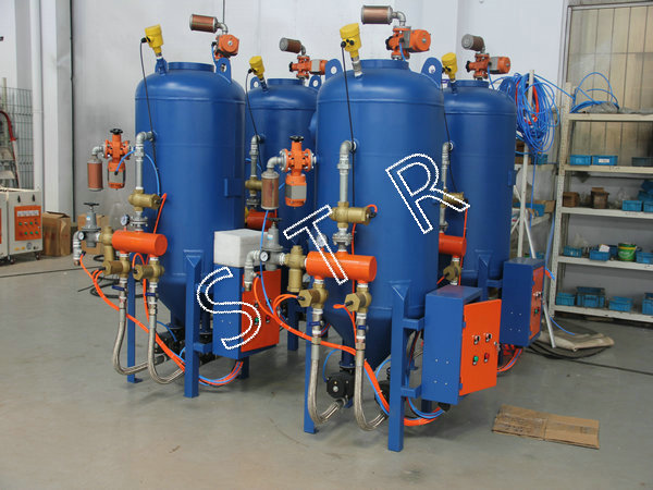 ①當下料倉無聊時,低料位感應器轉動,此時提供電流信號,激發時間繼電器,打開電磁閥,接通上料倉進氣閥,關閉上料倉排氣閥,上料倉封閉閥頂起,下料倉封閉閥下落,上料倉磨料進入下料倉,經延時一段時間后(延時器可調),自動斷開,電磁閥斷開后,上料倉封閉閥下落。
