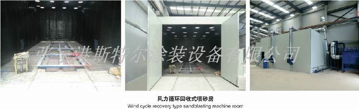 機械循環回收式噴砂房成套設備主要由噴砂房室體、照明系統、空氣動力回收地板、分選器、噴砂系統、除塵器、風機、控制系統、工件輸送系統及操作人員防護系統組成。