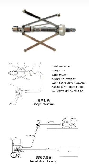 Apply YuXiaoKong and medium pipe wall coating, it is to use it without gas transmission to high voltage coating, through the special nozzle, to make the paint spray directly formed after flared (garden tapered, hollow), evenly spray in the pipe inner surface, so as to realize the pipe coating. NKP-type 1 is mainly used in Ф 50-Ф 300 mm pipe, coating viscosity shall not be higher than the 80 seconds (4 ford cup). If the paint is higher than 80 seconds, viscosity should be diluted solvent. NKP-type 1 basically from piping length restrictions, but had better not longer than 15 meters.