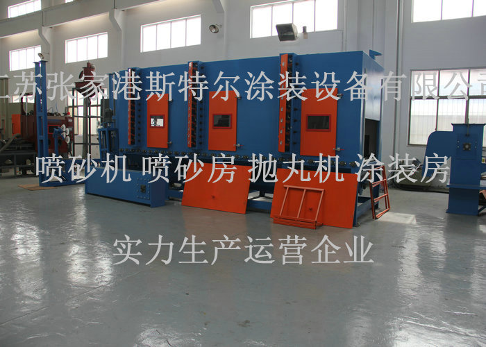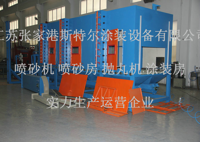 方形坩堝產品內壁處理要求而專門設計的專用型輸送式自動噴砂機,適合需求公司所提供的產品。根據需求公司對產品效率的要求,本機設置一套自動輸送線,共分五段線體。噴砂艙內共設三個噴砂位,工件通過輸送線體帶動步進方式分別在三個噴砂位進行噴砂加工清理,噴砂區域內共布置20支普壓高速噴砂咀,在噴砂區第一個噴砂位布置8支噴咀噴工件內底面,在噴砂區第二個噴砂位布置6支噴咀噴工件內前后側面,在噴砂區第三個噴砂位布置6支噴咀噴工件內左右側面,噴咀可根據加工需要,適當調整其噴射角度,其自動化程度較高。每個工件需間歇進行三次噴砂清理加工,才能完成整個內表面的清理。在出口處設有翻轉機構,用于傾倒內部的砂料,該動作自動完成,無需人工操作。 噴砂加工工藝