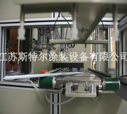 祝賀我公司為OPPO手機外殼定制的全自動玻璃水砂自動噴砂機交付客戶!! 全自動玻璃水砂自動噴砂機由自動上料機、自動噴砂機和自動下料機三大部分組成:首先由自動上料機將附有兩組Tray盤Port可自動交換,需人工放Tray盤至LD Port, Tray盤定位后,移栽Arm開始取片,玻璃整列,再由移栽Arm直接將玻璃放置在載具Stg上,送入噴砂設備,當一個Tray port 取完后,會報警提醒人員裝載新的Tray盤,當空Tray盤滿杯后設備會自動報警通知人員取走空Tray盤,以此循環動作.然后到全自動玻璃水砂自動噴砂機,由人工自行調配一定的水砂比例后設備自動進行混合攪拌,自動上料機構抓取玻璃放到輸送同步帶上,進入噴砂機腔體進行噴砂,噴砂作業結束后,進入水刀處進行噴淋,噴淋結束后由風刀進行吹干。吹干后移動至下料機移栽位置,由移栽將玻璃抓取至下料機FORK上,以此循環。噴砂、清洗、吹干區域有擋邊防止工件位移。最后自動下料機將附有兩組CST Port可自動交換,需人工放空的CST至UnLD Port, CST翻轉90°后,氣缸機械定位,由移栽arm從治具上取玻璃放置Fork上,送入CST, CST Port內的基板利用Fork方式由最高層開始放片,Fork 真空感知Sensor/玻璃光纖sensor OFF后,Fork自動退回到等待位置,以此循環。當CST裝滿后,設備會報警提示人員將CST取走并裝入空的CST。